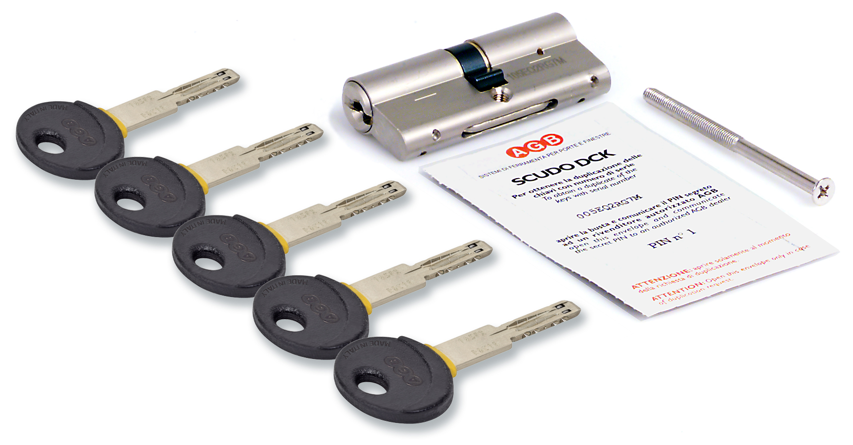 Cilindro di sicurezza che si caratterizza per la particolare conformazione della chiave piatta reversibile che ne permette la duplicazione solo al costruttore AGB, su specifica richiesta del proprietario mediante codice PIN. E' inoltre un cilindro che garantisce uno standard elevato di sicurezza passiva (resistenza ai tentativi di effrazione) grazie alle caratteristiche tecniche: - 15 pistoncini radiali e asimmetrici in acciaio inox temprato e perni fissi per azionare i rullini della chiave - 3 spine antitrapano in acciaio temprato su ogni lato - 5 chiavi piatte reversibili in alpacca con elementi mobili e impugnatura ergonomica brevettate da AGB - Barra antiscasso in acciaio speciale - Ingegno antistrappo in acciaio. Disponibile in versione doppia funzione (2 chiavi inserite contemporaneamente) - chiave personalizzabile con inserti di vari colori da ordinare a parte.