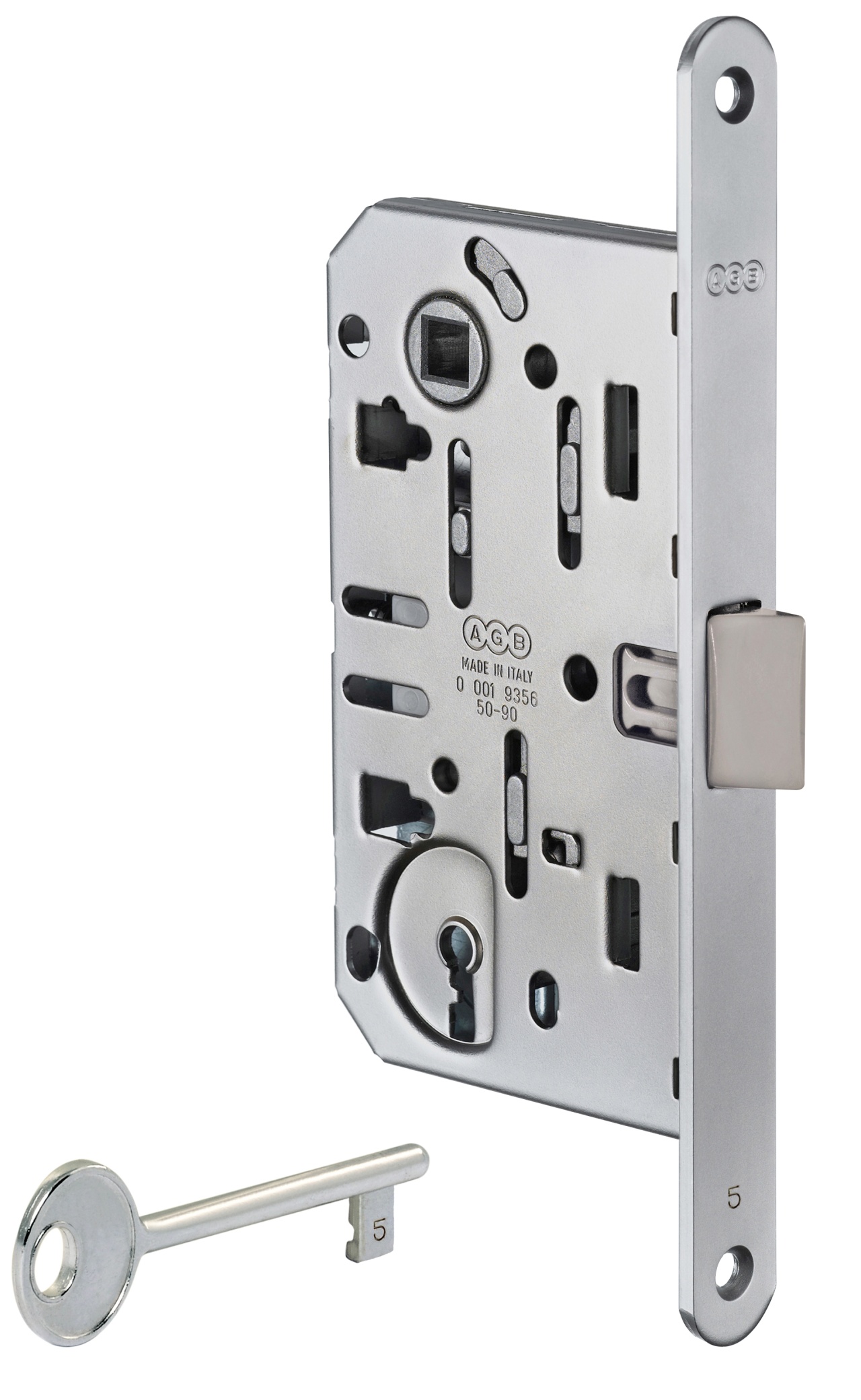 AGB - Serratura CENTRO bordo tondo con scrocco centrale e con chiave - col. 34 - CROMATO OPACO - entrata 50 - frontale 18X196 - interasse 90
