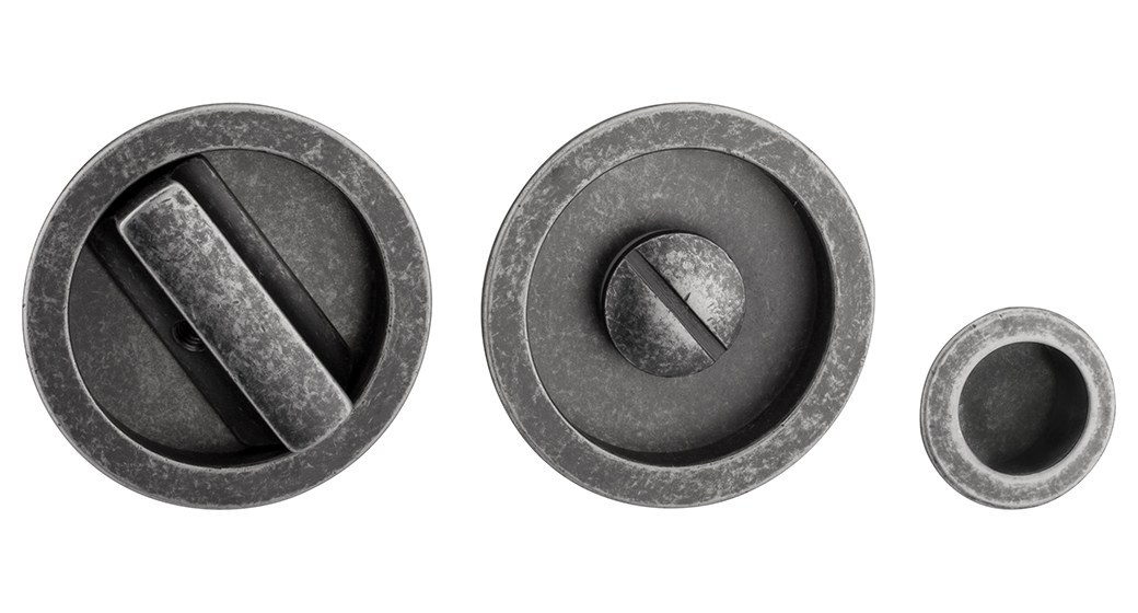 REGUITTI - Kit Maniglia Da Incasso ART. 508 tonda con chiavistello intaglio e maniglietta di trascinamento - mat. OTTONE - col. 47 ARGENTO VECCHIO (ANTIGERM®) - dimensioni Ø 57
