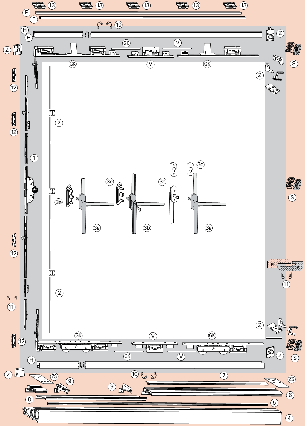 ROTO FRANK - Cremonese PATIO LIFE per alzante scorrevole altezza maniglia variabile senza foro cilindro e nottolini - gruppo / dimensioni 580 - entrata 30 - alt. man. 580 - lbb/hbb 690 - 870