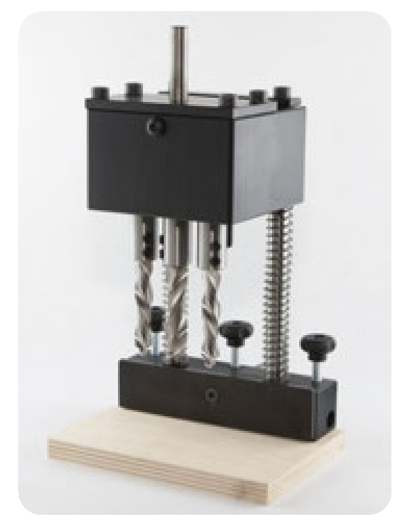 TRIMATIC PER CERNIERE I “Trimatic” sono maschere di foratura che consentono con un normale trapano a colonna o un trapano elettrico portatile di eseguire una serie di fori in una sola passata. Queste attrezzature si rivolgono soprattutto ad artigiani, hobbisti e fai da te che devono creare i fori per fissare le cerniere. Il gruppo dei “Trimatic” a tre mandrini è adatto ad eseguire tre fori contemporaneamente con interasse dipendente dal tipo di cerniera da fissare (vedi schema di foratura sotto). Il diametro delle punte dipende dal tipo di cerniera utilizzato. È importante ricordare che la punta centrale ha rotazione destra e le punte laterali hanno rotazione sinistra. NB: Punte a forare non incluse.